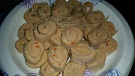 Der Geschmack von Buffalo Chicken Wings mit Blauschimmelkäse, Sellerie und Karotten, alles eingewickelt und in Pinwheels geschnitten als Vorspeise.