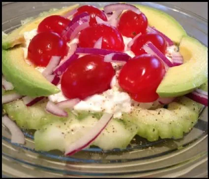 Salat aus Gurken, Karotten, roten Zwiebeln, süßen Traubentomaten und Avocado.