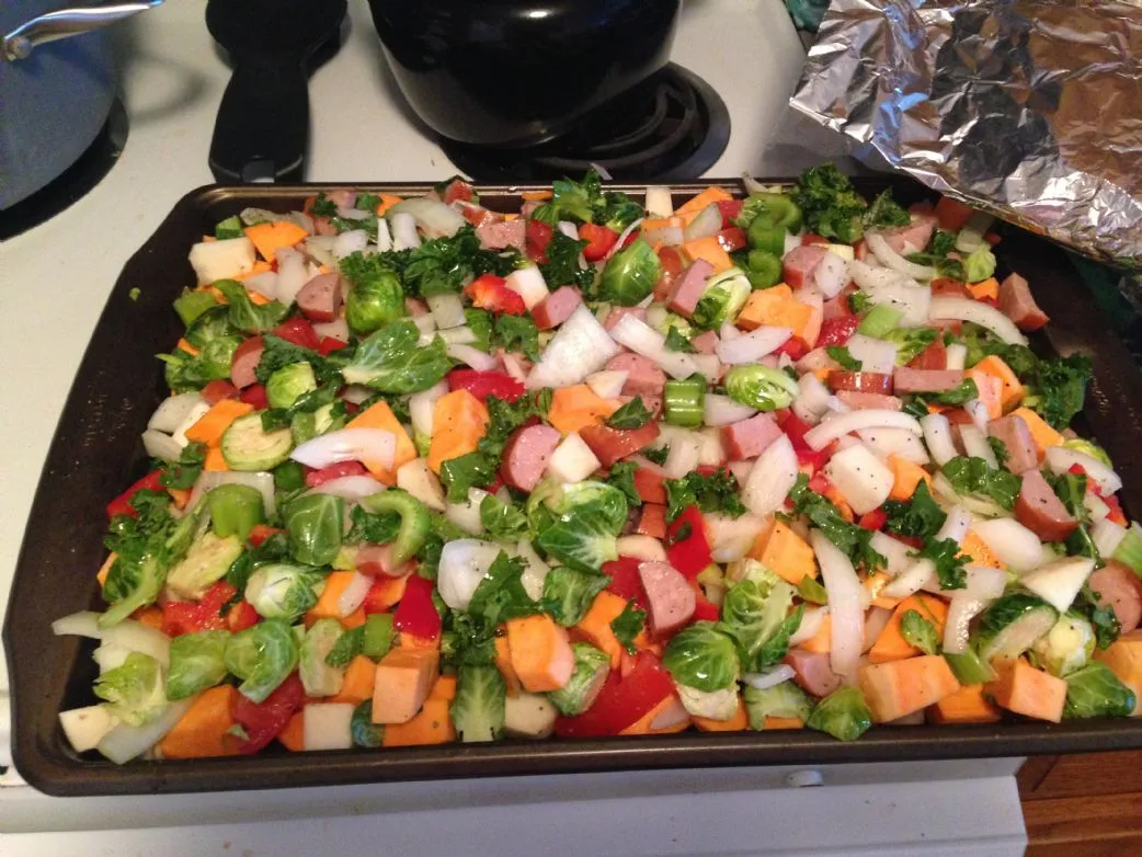 Würzige Suppe mit geröstetem Gemüse und Hähnchen-Apfel-Wurst. Ideal für kalte Tage oder verstopfte Nasen! Fast 100 % des täglichen Bedarfs an Vitamin C und würzig, um Erkältungen zu helfen.