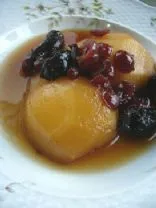 Der Tee verleiht der Sauce für die Birnen, getrocknete Aprikosen und Kirschen eine elegante Komplexität. Die Verwendung von getrockneten Sauerkirschen anstelle von Bing-Kirschen hilft, die Süße auszugleichen.