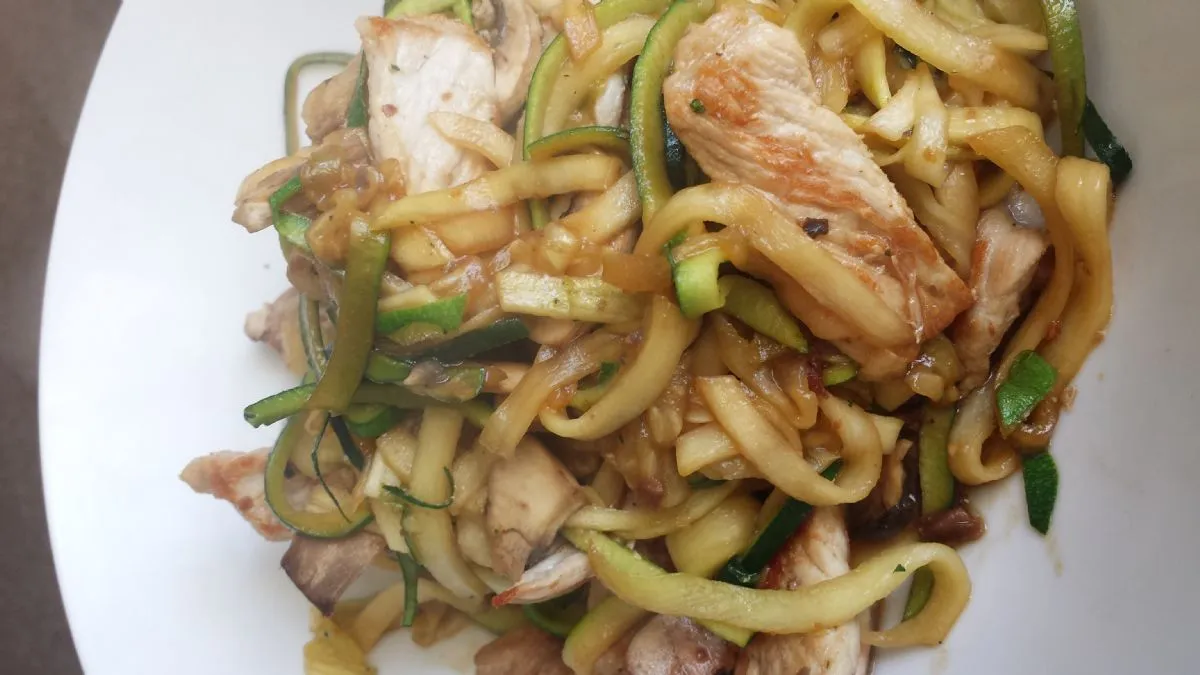 Zucchini-Nudeln, Pilze, Schweinefleisch und eine Ahorn-Miso-Sauce