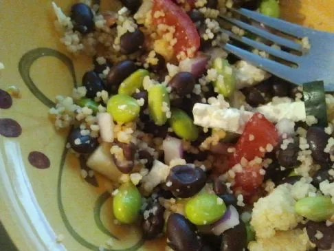Eine schöne Mischung aus Farben! Couscous, schwarze Bohnen, Edamame, Tomate, Zucchini und Feta.