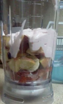 So verwirrend der Titel auch ist, es ist tatsächlich ganz einfach. Ich habe dies spontan mit Erdbeeren, Bananen und Pfirsichen gemacht. Der Joghurt, den ich verwendet habe, ist eine generische Marke, verwenden Sie gerne Ihre Lieblingsmarke, denken Sie nur daran, dass die Nährwertangaben auf Sunnyside basieren :) Außerdem basiert das Rezept auf einer Portion Joghurt, daher ist das Rezept für eine Portion, aber man kann es auch teilen (es ergibt fast einen vollen Mixer!).