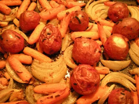 Im Ofen geröstete Kartoffeln, Zwiebeln und Karotten mit Knoblauch und Olivenöl. Sellerie wäre auch gut, ich hatte heute keinen. Auch sehr gut mit Fenchel.