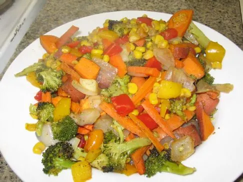 Geröstete Paprika, Tomaten, Zwiebel, Karotten und Sellerie kombiniert mit Blumenkohl und Blattgemüse.