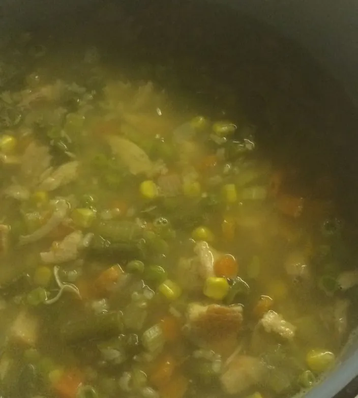 Sehr einfache Hühnchen-, Reis- und Gemüsesuppe. Gut für das Mittagessen oder Abendessen.