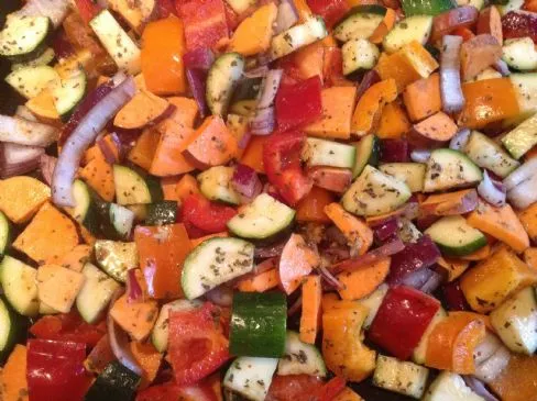 Geröstetes Gemüse mit Basilikum, Kreuzkümmel und Knoblauch.