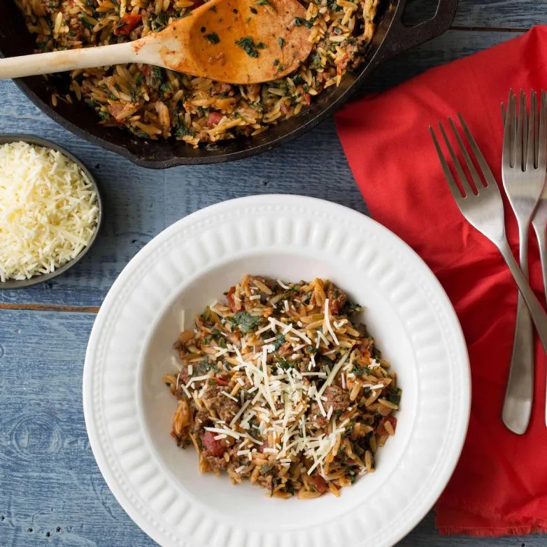 Die Rinder-Orzo-Pfanne ist eines der bestbewerteten Rezepte auf Cozi aller Zeiten. Patsy P. hat es geteilt und sagt: "Meine Familie fordert es fast wöchentlich an!"