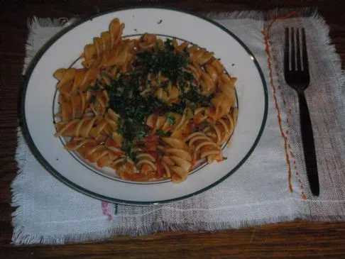 Spiralnudeln in Sauce mit Petersilien-Topping.