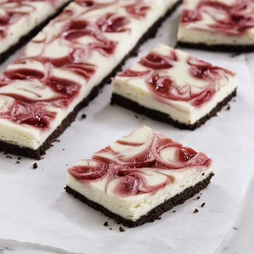 Einfache Himbeer-Cheesecake-Riegel mit einem Schokoladen-Graham-Cracker-Boden, bedeckt mit einer Frischkäse-Schicht und mit Himbeermarmelade marmoriert.