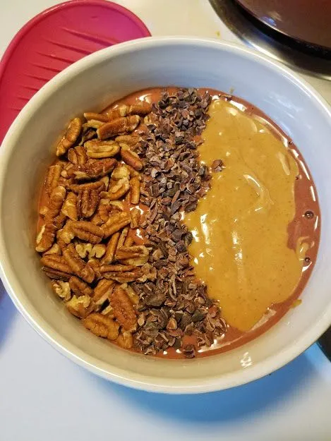 Gekrönt mit Pekannüssen, Kakaonibs und Erdnussbutter.