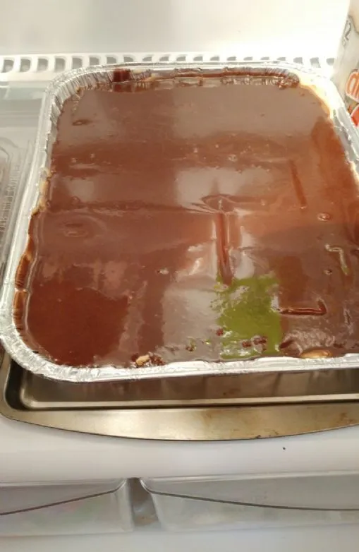 Schichten von Zutaten: Graham-Cracker, Pudding-Mischung, Graham-Cracker, Pudding-Mischung, Graham-Cracker, Schokoladenglasur.