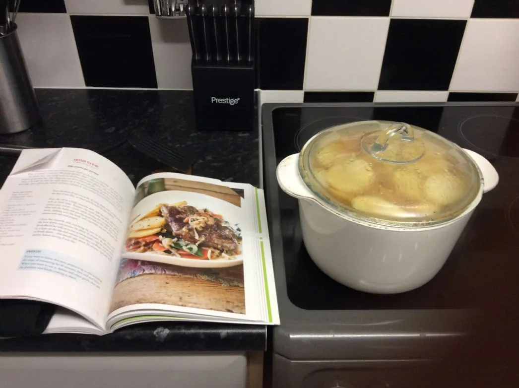 Paraphrasierung; Irischer Eintopf, zubereitet mit Lammkeulensteak anstelle von fettem Halsfilet. Schön einfach, alles in einem Gericht, wenn man die Nacht vorher vorbereitet, könnte man es am nächsten Tag leicht in den Slow Cooker geben für das Abendessen, man müsste nur die Kartoffeln gegen Ende, 20 Minuten oder so, hinzufügen, wenn man es auf dem Herd macht.