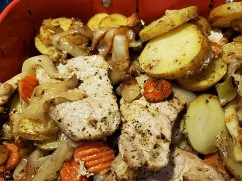 Zartes und saftiges Schweinefleisch, im Ofen mit saisonalem Gemüse geröstet für ein gesundes und einfaches Abendessen!
