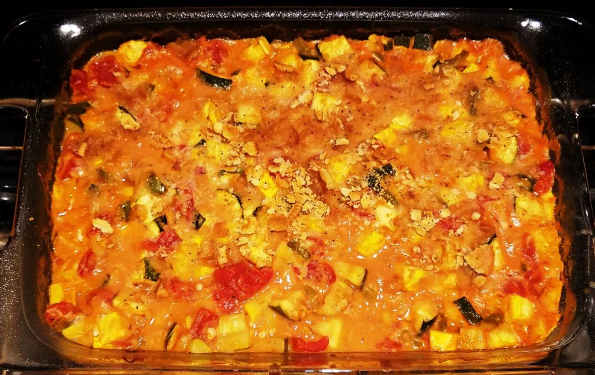 Ein leichter Auflauf aus Zucchini und gelbem Kürbis.