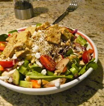 Alle gesunden Gemüse, die man sich vorstellen kann, garniert mit einer Mischung aus Sprossen (Alfalfa, Brokkoli usw.), Feta-Käse, Pinienkernen und köstlichem roten Paprika-Tempeh!
