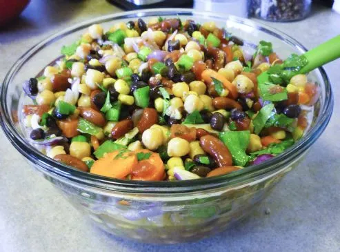 Frisches Gemüse und gemischte Bohnen mit einem leichten Essig-Öl-Dressing vermischt. Ideal für Buffets oder als Beilage zu jeder Mahlzeit!