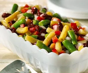 Dieser Salat ist eine Kombination aus frischem Gemüse und Dosenbohnen. Er ist ein sehr sättigender Snack oder eine kalte Beilage mit einem leicht süßen, aber säuerlichen Geschmack. Ich mache eine große Menge und lasse sie im Kühlschrank, um die ganze Woche davon zu essen.