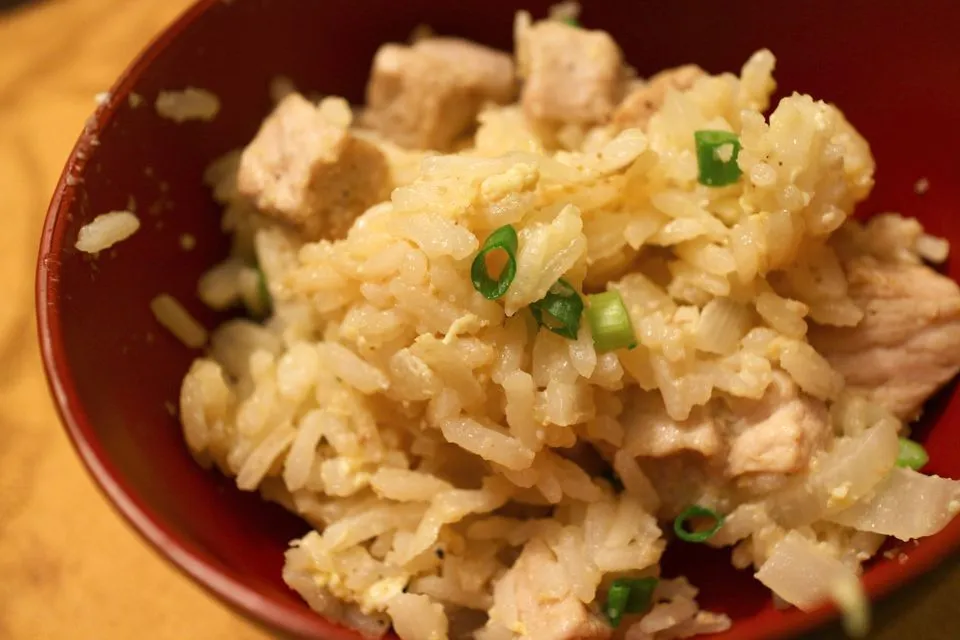 Schweinekotelett, Reis, Erbsen & Zwiebel Pfannengericht