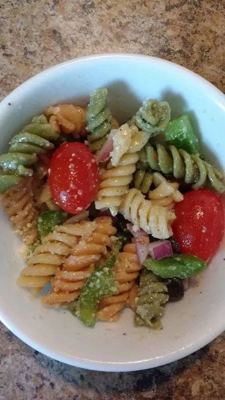 Salat aus dreifarbigen Nudeln und dem Zesty Italian-Paket von Good Seasons. Schwarze Oliven, Paprika, Zwiebel und Tomaten.