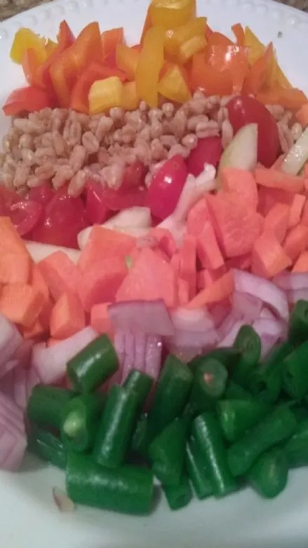 Dies ist ein Salat, den ich zubereite, um ihn zur Arbeit zum Mittagessen mitzunehmen. Ich versuche, tagsüber mehr Kalorien zu mir zu nehmen, daher ist er dichter als die meisten Salate. Man kann die Kalorien und das Fett reduzieren, wenn man ihn stattdessen mit einem zerbröselten Gemüseburger belegt. Man kann auch ein kalorienärmeres Salatdressing wie das asiatische Spritz 1 Kalorie pro Portion verwenden.