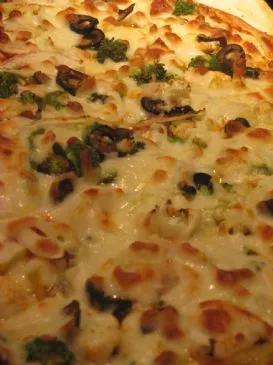 Zwiebel-, schwarze Oliven- und Pilz-Pizza