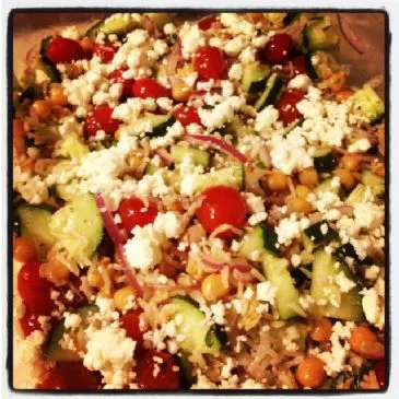 Vollkornvariante eines griechischen Salats, ideal, um eine große Menge zuzubereiten und für die Woche zum Mittagessen mitzunehmen.