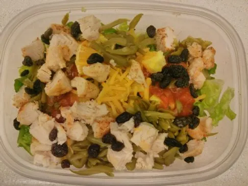 Hühnchensalat (mit Hühnchen, grünen Bohnen, Cheddar-Käse, Orange, Salsa, Rosinen)